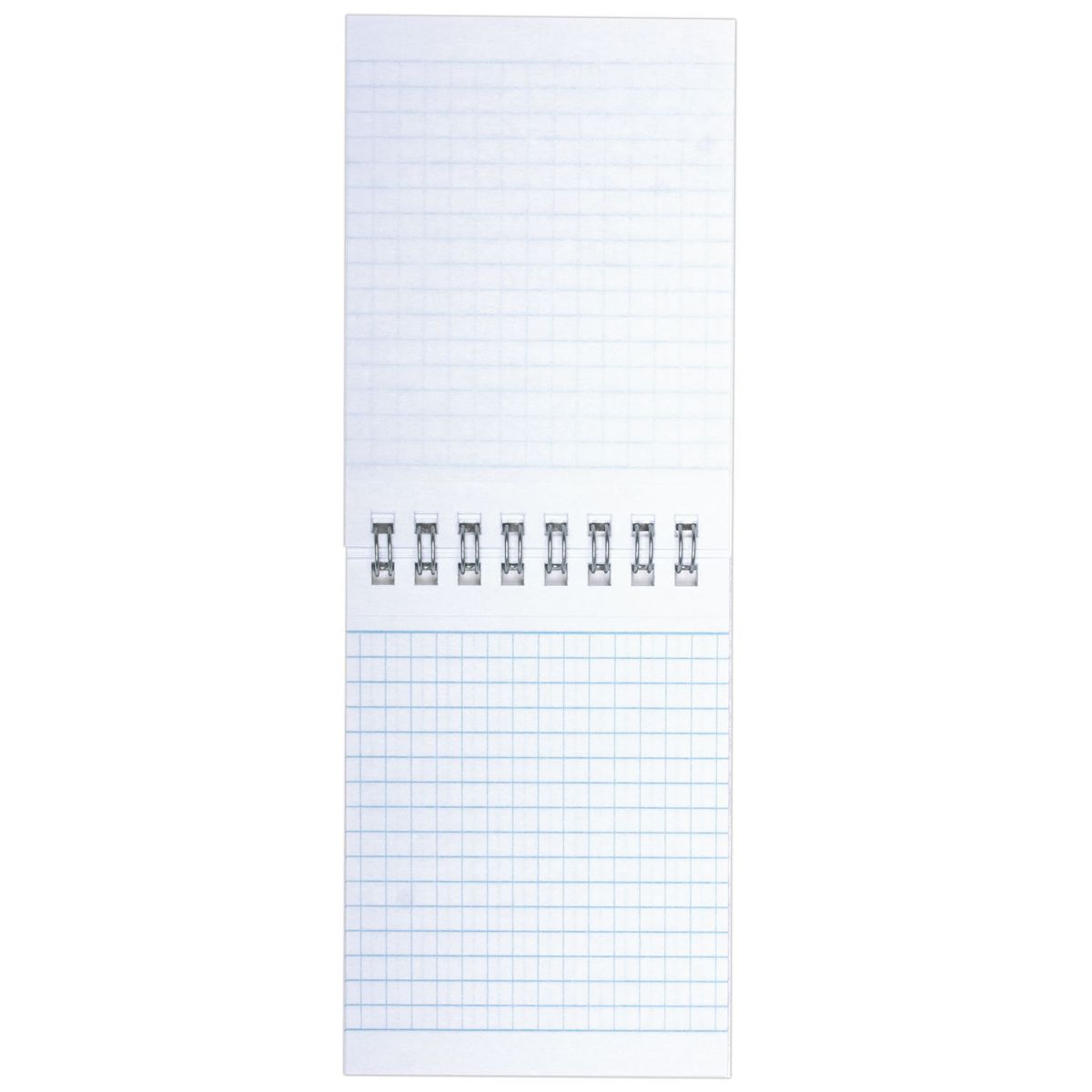 Блокнот формата А7 на евроспирали содержит 40 листов с линовкой в клетку. Имеет верхнее расположение переплета. Обложка выполнена из мелованного картона плотностью 200 г/м2. Внутренний блок состоит из белой офсетной бумаги плотностью 60 г/м2.